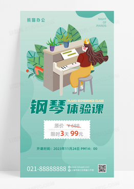 绿色清新插画钢琴体验课钢琴培训招生海报