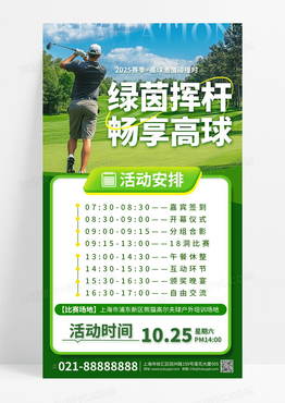 蓝绿色实景风绿茵挥杆畅享高球高尔夫活动海报