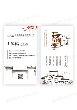 水墨装修季节白色黑色橙色红梅阁楼竖版名片模版