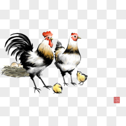 手绘水墨画国画大公鸡和小鸡免抠元素