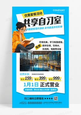 蓝色简约风共享自习室营业促销手机海报