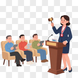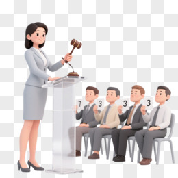 3D卡通穿蓝灰西服的女拍卖员举槌拍卖场景免抠元素
