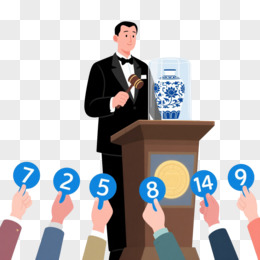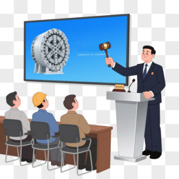 卡通男拍卖员站在大屏幕前举槌拍卖场景免抠元素