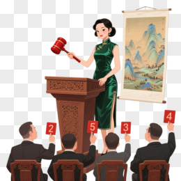 卡通穿旗袍的女拍卖员拍卖山水画免抠元素