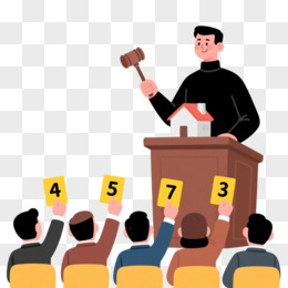 卡通男拍卖员举着法槌下面举着号牌免抠元素
