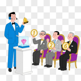 卡通穿蓝西服的男拍卖员拿着铃铛拍卖钻石拍卖场景免抠元素