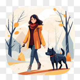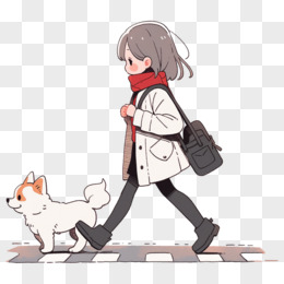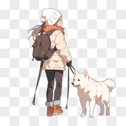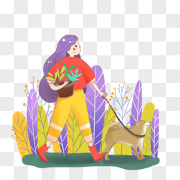 女孩遛狗卡通插画