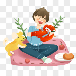 手绘插画风男孩吃小龙虾场景元素