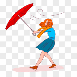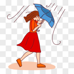 卡通手绘女孩的伞被风吹起来素材