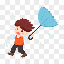 手绘卡通大风中打伞的男生素材