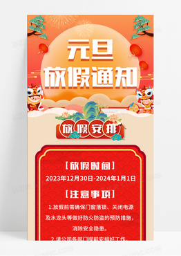 国朝风手绘插画龙年新年2024元旦放假通知长图