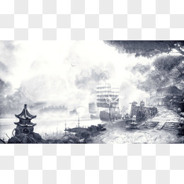 水墨画江南河岸帆船古风海报背景
