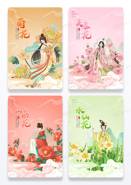 十二花神 手绘 古风美女 菊花 芙蓉花 山茶花 水仙花 借势海报 套图