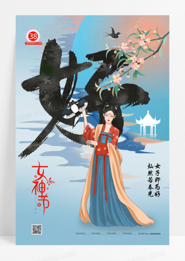 蓝色古风女子字体设计妇女节海报