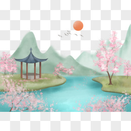 中国风水墨古风春天桃花亭子意境图