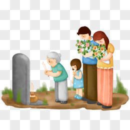 手绘卡通父女烧纸钱祭拜场景免抠素材