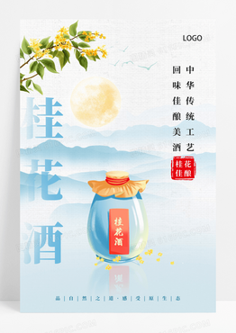 蓝色水墨山水桂花灯笼回味佳酿美酒海报桂花酒海报