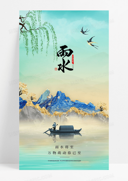 国潮鎏金渐变水墨雨水手机宣传海报二十四节气海报手机海报