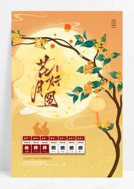 国潮中秋节月亮花鸟放假通知海报