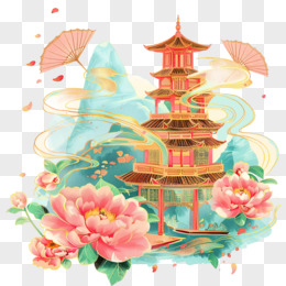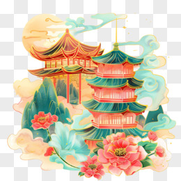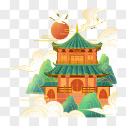 手绘国潮亭台楼阁建筑素材