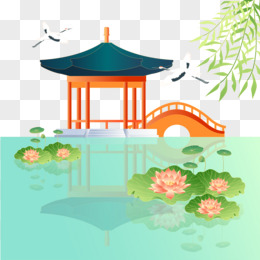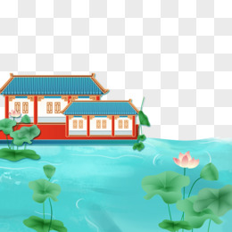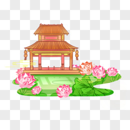 手绘国潮线条感国风亭子楼台荷花免抠元素