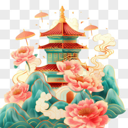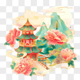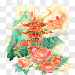 国潮牡丹假山中式建筑手绘免抠元素