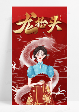 红色大气国潮插画二月二龙抬头龙抬头长图
