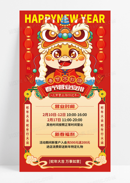 红色国潮狮子头蛇年新春春节营业海报春节营业时间