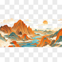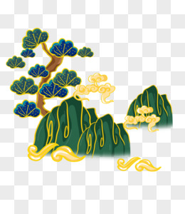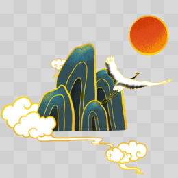 手绘国潮金线青山绿水凉亭大雁景观元素
