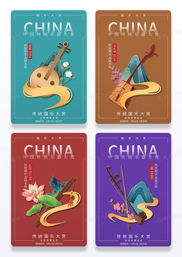 手绘国潮风中国传统古典乐器古筝元素