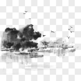 手绘水墨山水湖面插画元素
