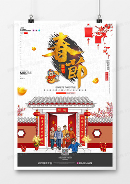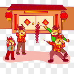 手绘大人贴春联小孩放鞭炮场景插画元素