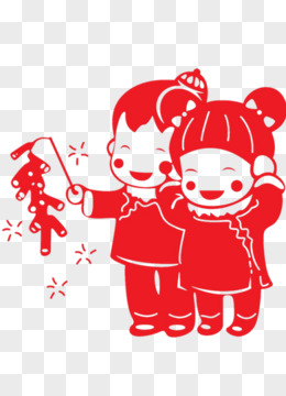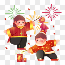 手绘卡通男孩女孩放鞭炮免抠素材