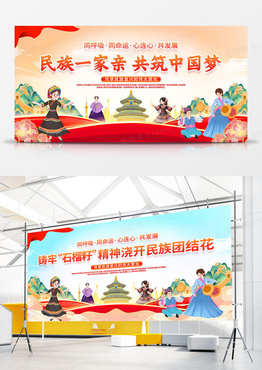 创意国潮插画民族一家亲共筑中国梦民族团结展板宣传栏