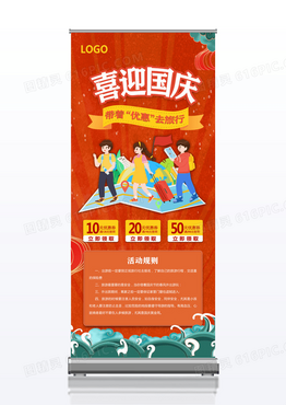 红色国潮卡通时尚喜迎国庆国庆节旅游优惠旅游活动促销展架设计