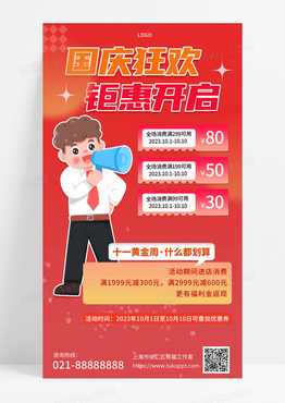 活动促销红色大气卡通人物国庆狂欢钜惠开启黄金周活动福利优惠手机宣传海报