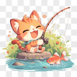 卡通插画风小猫钓鱼绘本故事免抠元素