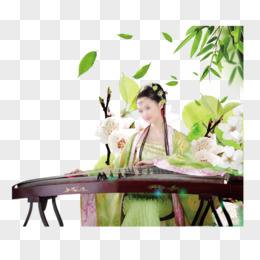 中国风古筝美女竹叶漂浮树叶桃花