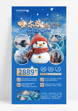 蓝色简约时尚冰雪小镇哈尔旅游活动海报