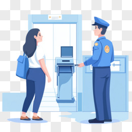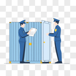 平面插画两个穿蓝色制服的海关工作人员在检查集装箱免抠元素