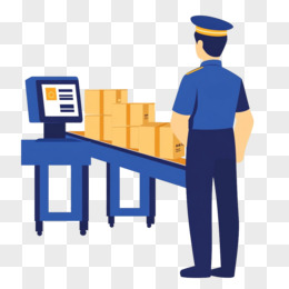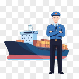 平面插画穿蓝色制服的海关工作人员站在装满集装箱的货轮前面免抠元素