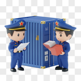 3D插画两个穿蓝色制服的海关工作人员正在检查一个集装箱免抠元素
