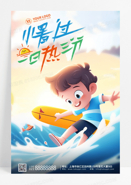 小暑卡通男孩在海面上玩冲浪创意插画海报