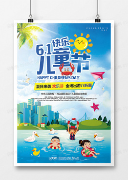 蓝色游泳海水海浪清爽城市建筑简约风欢乐六一儿童节海报
