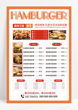 橙色插画手绘汉堡套餐菜单海报