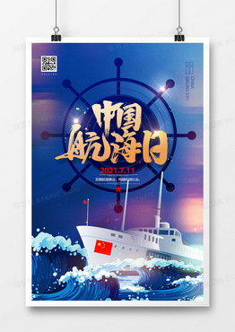 蓝色手绘711中国航海日海报设计