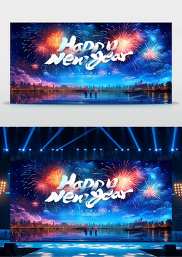 蓝色油画2024元旦新年HappyNewYear展板设计