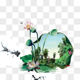 手绘微景观国潮风山水素材荷花塘鲤鱼素材
