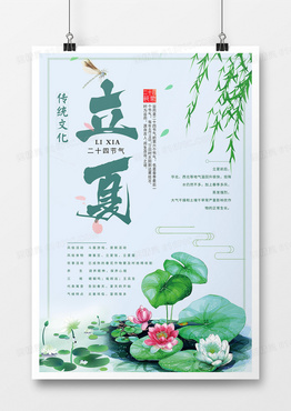 蓝色创意扁平简约中国风荷花传统节气立夏海报