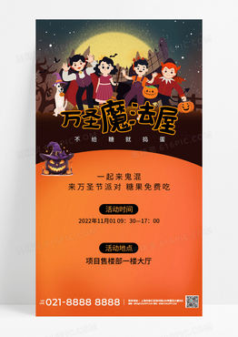 黑橙色南瓜蜘蛛网恐怖南瓜万圣节鬼屋主题宣传海报